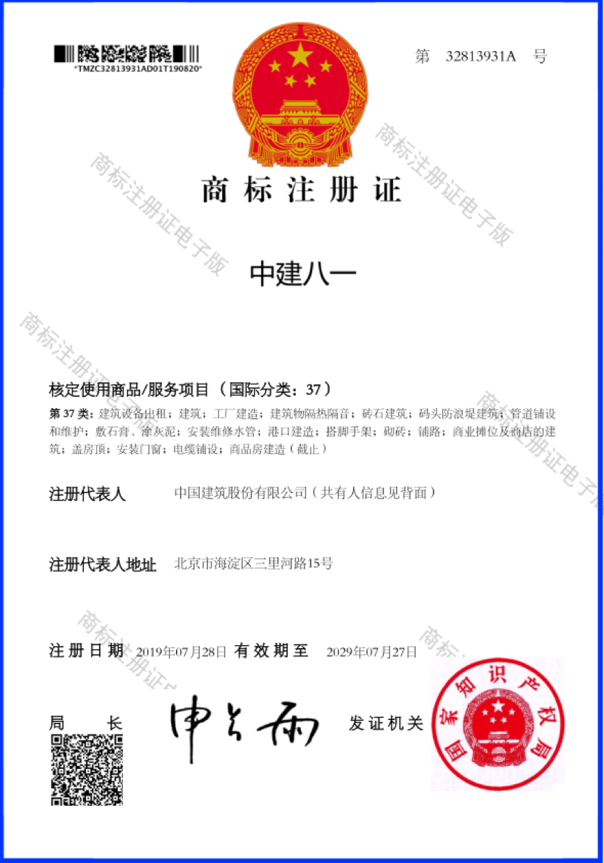近日,由中建八局一公司申請的“中建八一”商標順利通過國家知識產權局的評審認定,獲得商標注冊證書,成為中建建筑品牌體系下的子商標品牌。