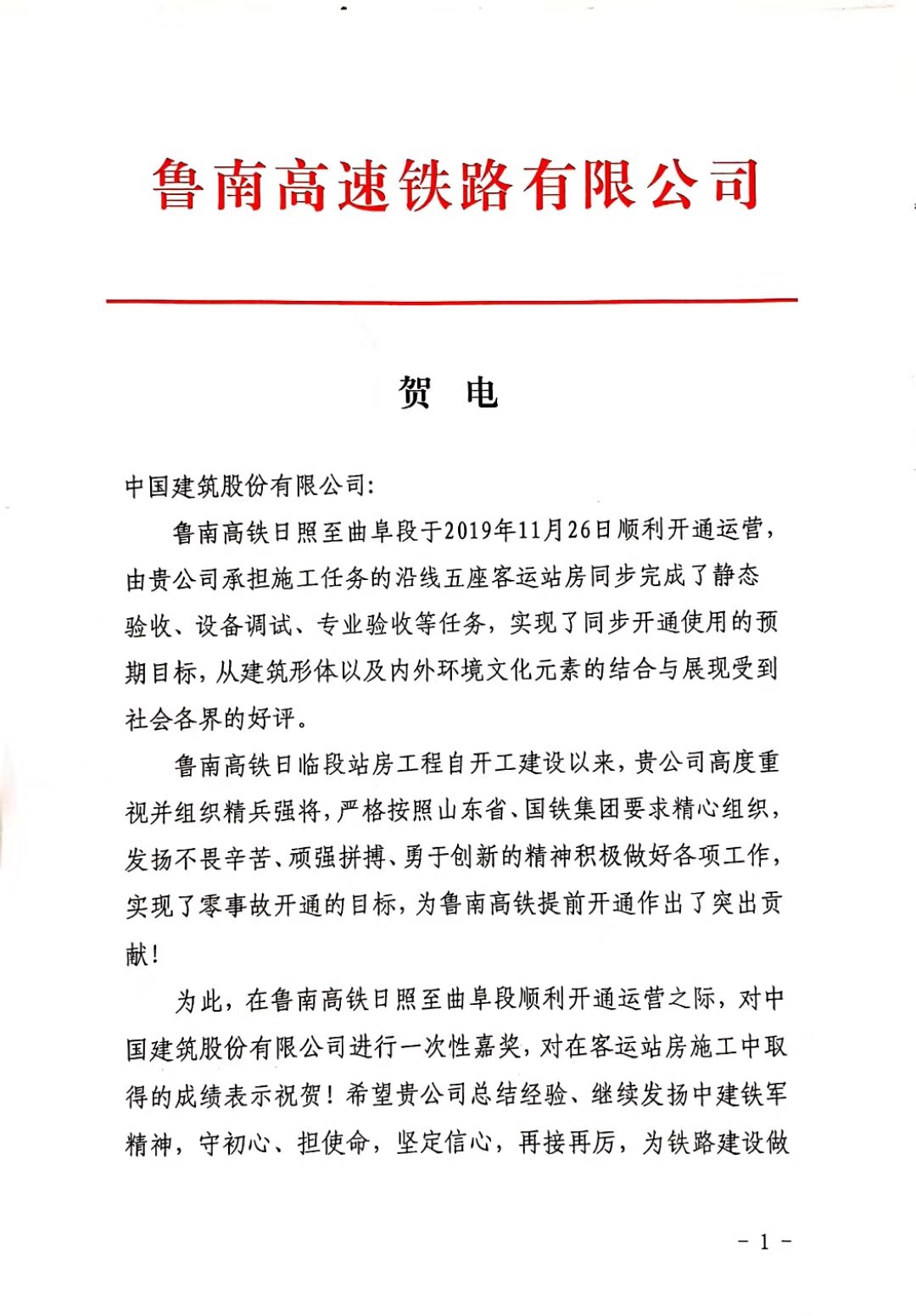 魯南高速鐵路是由山東省總工會選定的省級示范性重點工程勞動競賽項目,自競賽開啟,魯南高鐵站房項目緊扣“加快施工,整體推進,全面提升,樹立形象”的競賽主題,項目以高標準、嚴要求、重實效的指導思想開展各項工作,精心組織、攻堅克難,完成了各關鍵階段的預期目標,實現完美履約。在競賽中榮獲“山東省工人先鋒號”以及“山東省五一勞動獎章”先進個人榮譽稱號。