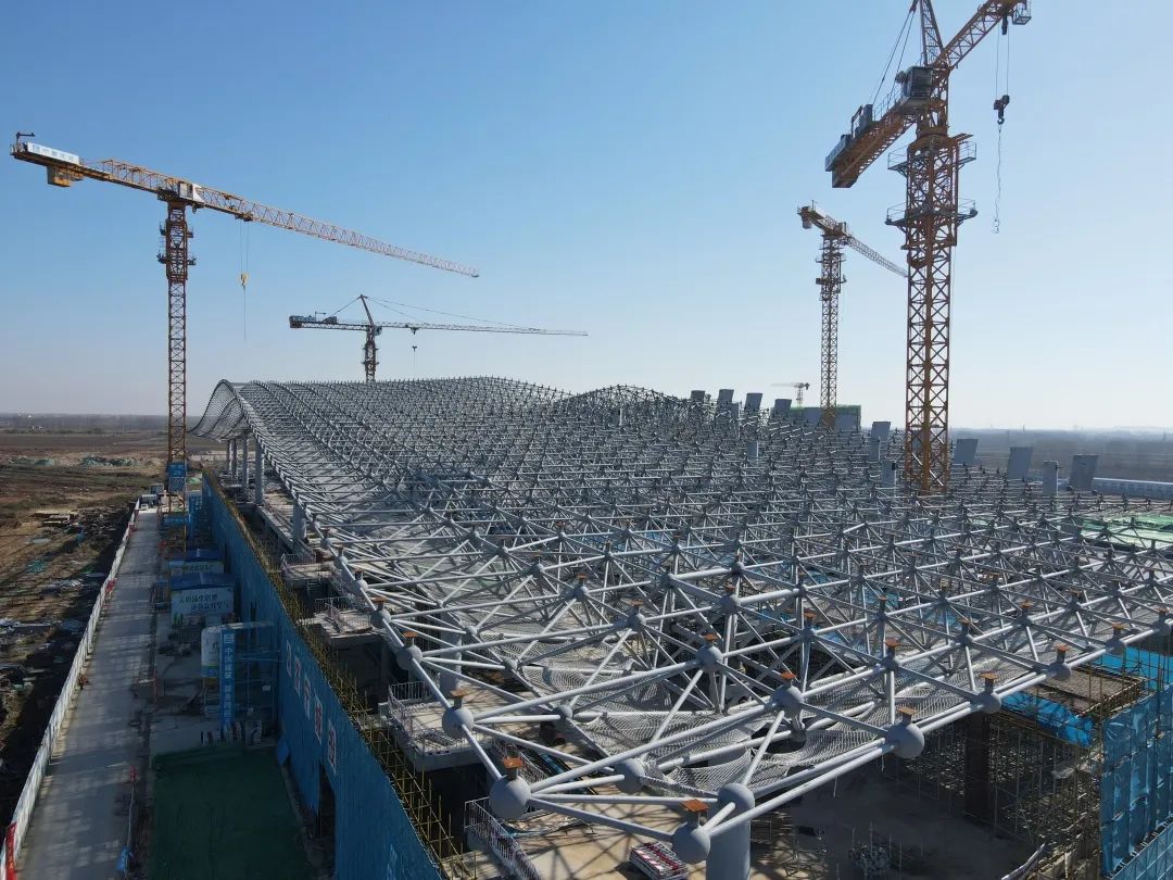 項目應用智慧建造體系現場管理數字化、實時化、精確化,航站樓鋼網架屋蓋主體采用4643個焊接球、17932根桿件、網架重量達980.71噸、鋼結構總用鋼量6000余噸,項目建立精確BIM模型,導入有限元力學分析軟件,測算桿件力學性能與面域受力情況,實測實量進行偏差校核,將網架拼接誤差控制在毫米級,最終完美演繹機場檐面。