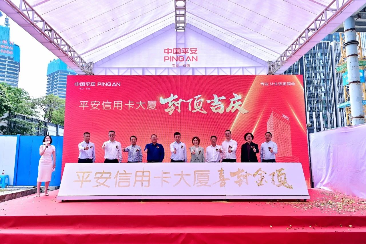 10月12日,平安信用卡大廈項目舉行主體結構封頂儀式。 平安銀行股份有限公司信用卡中心總裁劉顯峰,平安不動產有限公司首席運營官曾燦霞,中建八局華南分局黨委書記郭青松及各參建單位代表參加儀式。