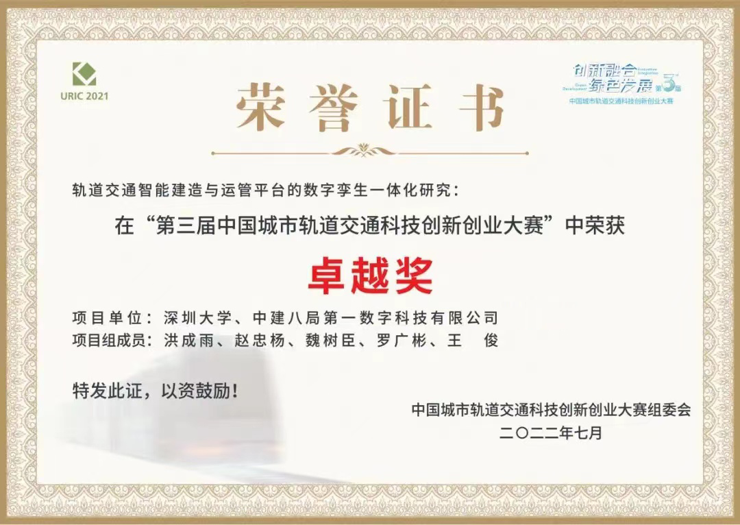 近日,第三屆中國城市軌道交通科技創新創業大賽全國總決賽暨頒獎盛典在北京圓滿舉行,一公司數字科技公司與深圳大學聯合創新的“軌道交通智能建造與運管平臺的數字孿生一體化研究”項目,榮獲總決賽基礎研究組最高獎“卓越獎”。