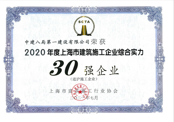 中建八局一公司榮獲“2020年度 上海市建筑施工企業(yè)綜合實力30強企業(yè) (進(jìn)滬施工企業(yè))”稱號