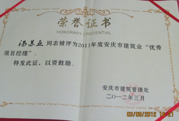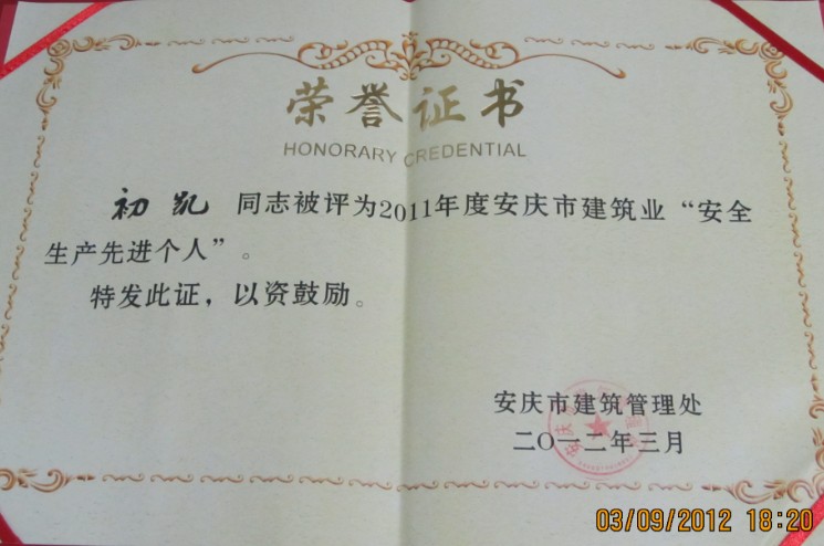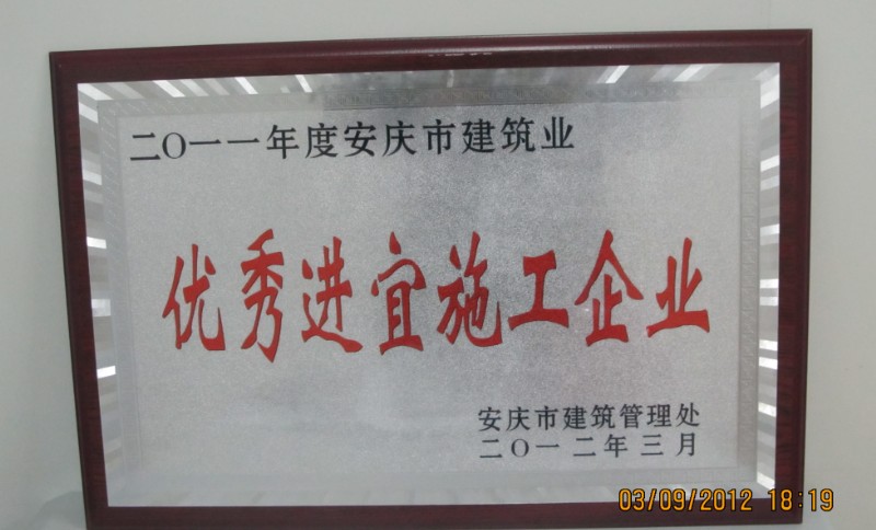 3月9日,安慶市建委隆重召開2011年度全市建筑業(yè)評優(yōu)評先暨總結(jié)大會,我局榮獲“優(yōu)秀進宜施工企業(yè)”榮譽稱號、一公司湯蘇亞、初凱分別榮獲“優(yōu)秀項目經(jīng)理”、“安全管理先進個人”榮譽稱號。