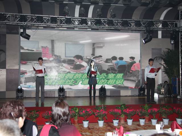 團拜會演出在富有激情的舞蹈《南非風情》中拉開了帷幕。整臺演出精彩紛呈,高潮迭起。員工自編自演的各類節目豐富多彩,幸運大抽獎更是讓員工驚喜連連,演出現場歡聲笑語不斷。相聲《咱公司的那點事》、小品《牛郎與織女》、啞劇《候車室的故事》讓現場觀眾笑成一片;歌曲《相親相愛》唱出了一公司員工團結互助是一家人的心聲;歌伴舞《荷塘月色》在現場燈光和舞臺的配合下,為大家呈現了一幅唯美的畫面;別具風格的三句半《公司喜事多》,讓大家過了一把情景劇版三句半隱;情景詩朗誦《閃亮的日子 閃亮的青春》則為大家講述了一群年輕人到工地后半年的切身感受;歌手楊坤的《無所謂》被演員模仿的惟妙惟肖,足以以假亂真;舞蹈串燒《青春旋律》讓大家感受到了公司年輕人的青春活力;小品《施工情》講述了公司員工舍小家顧大家、令行禁止、使命必達的精神,得到了現場觀眾的共鳴。演出在氣勢磅礴的《走向復興》中圓滿落幕,出席團拜會的領導同志走上舞臺,同全體演員合影留念。