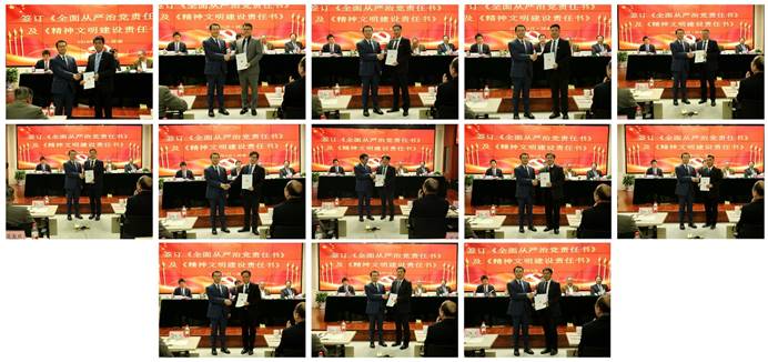 會上,濟南公司、華南公司、中原公司、裝飾公司四家二級單位書記作了工作述職。公司黨委書記、董事長董文祥代表公司黨委與13家二級單位簽訂并發放了《全面從嚴治黨責任書》、《精神文明建設責任書》。