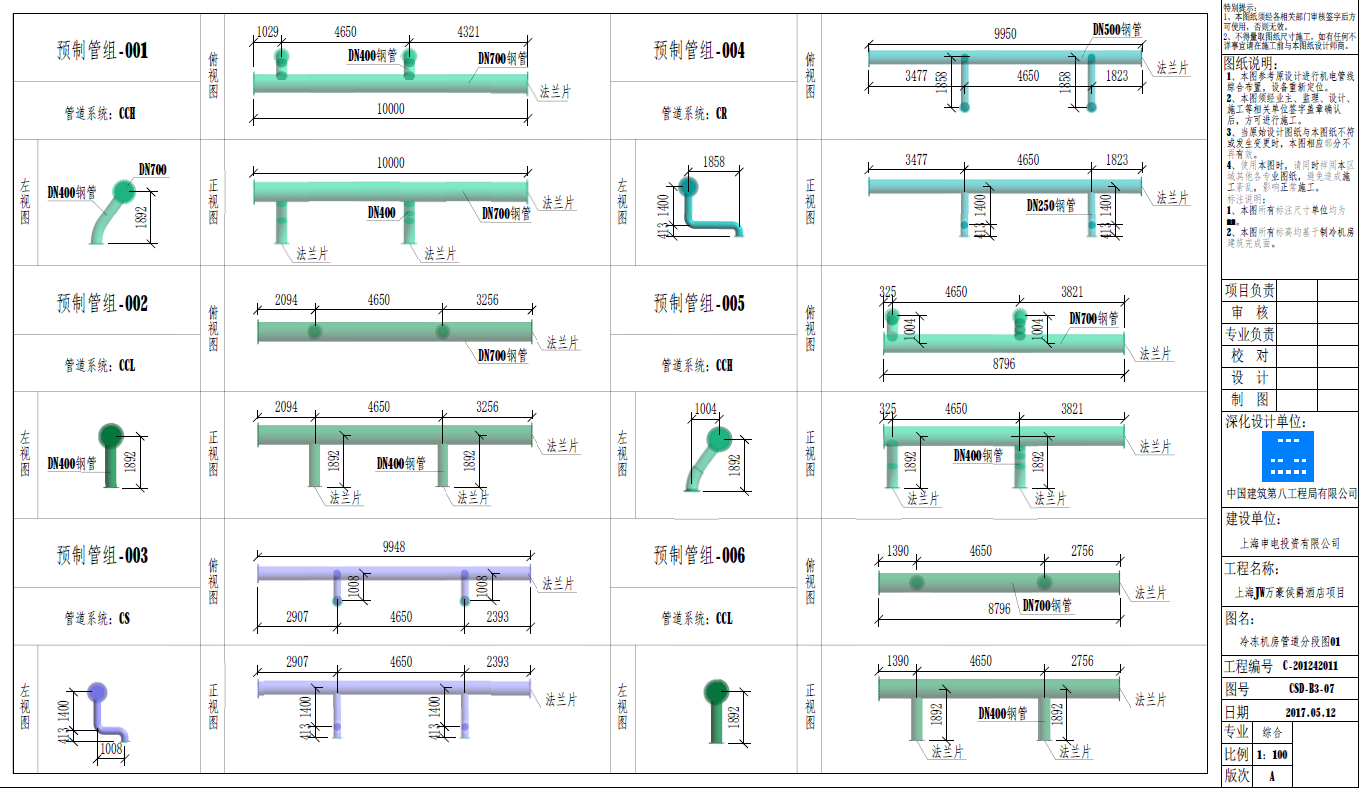 機(jī)房深化設(shè)計(jì)并出具圖紙:分析圖紙并收集整合大量資料;對(duì)機(jī)房?jī)?nèi)的機(jī)械設(shè)備、閥部件等構(gòu)件進(jìn)行1:1毫米級(jí)精細(xì)化建族;充分利用狹小機(jī)房空間,深化設(shè)計(jì)形成多套方案;利用BIM模型結(jié)合VR虛擬現(xiàn)實(shí)技術(shù)選擇最優(yōu)的方案,并運(yùn)用Revit軟件直接出圖;綜合考慮施工順序、運(yùn)輸空間、操作便利性等因素,對(duì)設(shè)備、管道等進(jìn)行分段并形成加工圖紙。最后,將預(yù)制化圖紙交付場(chǎng)外工廠進(jìn)行預(yù)制化加工。整個(gè)過(guò)程用時(shí)25天。