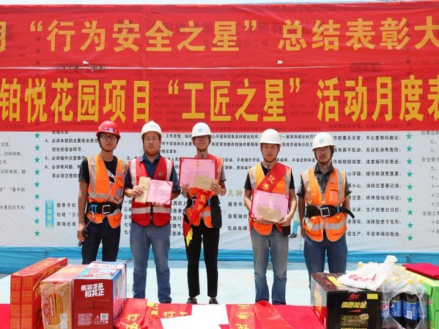大會開始,項目經(jīng)理吳超、安全總監(jiān)王旭博、責任工程師趙義在會上發(fā)言,首先對近來施工現(xiàn)場作業(yè)人員的安全防護用具佩戴情況、現(xiàn)場吸煙情況及各班組的班前教育情況進行了通報,然后對所有管理人員及現(xiàn)場作業(yè)人員宣貫了公司班前活動制度及班前活動開展情況抽查的通告;接著質(zhì)量總監(jiān)李志軍對“質(zhì)量月”活動的實施細則和要求進行了宣貫,并鼓勵全體工人爭當優(yōu)秀工匠,繼續(xù)發(fā)揚工匠精神,創(chuàng)造優(yōu)良的施工品質(zhì)。隨后由監(jiān)理張新源、王旭博、李志軍宣布獲獎名單,并分別給獲獎人員頒發(fā)獎勵。最后吳超對此次“行為安全之星”、“工匠之星”表彰大會做總結(jié),并給所有現(xiàn)場作業(yè)人員發(fā)放了防暑降溫用品。