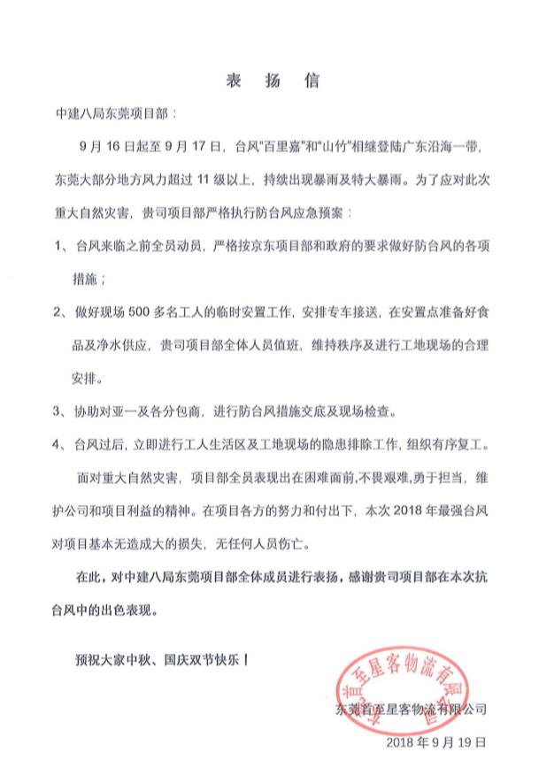 近期,東莞京東項(xiàng)目接到來自業(yè)主東莞首至星客物流有限公司的表揚(yáng)信,對(duì)項(xiàng)目部全體成員應(yīng)對(duì)超強(qiáng)臺(tái)風(fēng)“山竹”的出色表現(xiàn)進(jìn)行表揚(yáng)及感謝。應(yīng)對(duì)此次超強(qiáng)臺(tái)風(fēng),項(xiàng)目部嚴(yán)格執(zhí)行防臺(tái)風(fēng)應(yīng)急預(yù)案,按京東項(xiàng)目部和政府的要求做好防臺(tái)風(fēng)的各項(xiàng)措施,妥善安排500多名工人的臨時(shí)安置,并在臺(tái)風(fēng)過后立即進(jìn)行生活區(qū)及現(xiàn)場(chǎng)的隱患排除工作,組織有序復(fù)工。經(jīng)項(xiàng)目全員的努力付出,此次2018最強(qiáng)臺(tái)風(fēng)對(duì)項(xiàng)目基本未造成大的損失,無任何人員傷亡。京東項(xiàng)目部全體員工也將繼續(xù)發(fā)揚(yáng)不畏困難,勇于擔(dān)當(dāng)?shù)木瘢S護(hù)公司和項(xiàng)目利益。(王曦)