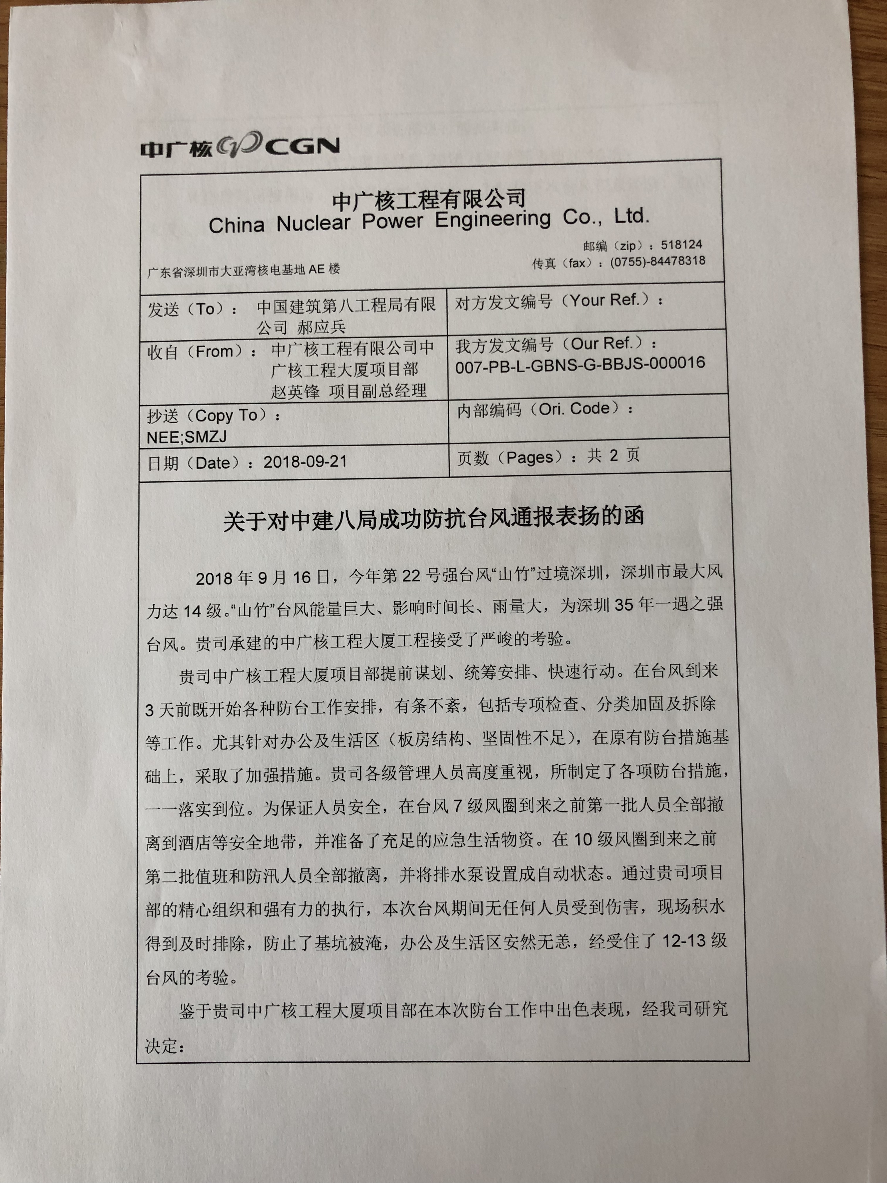 近日,中建八局華南分局收到來自業主中廣核工程有限公司的表揚信,對公司中廣核工程大廈項目在開工后現場實施狀態以及項目部全體成員應對超強臺風“山竹”的出色表現進行表揚及感謝。