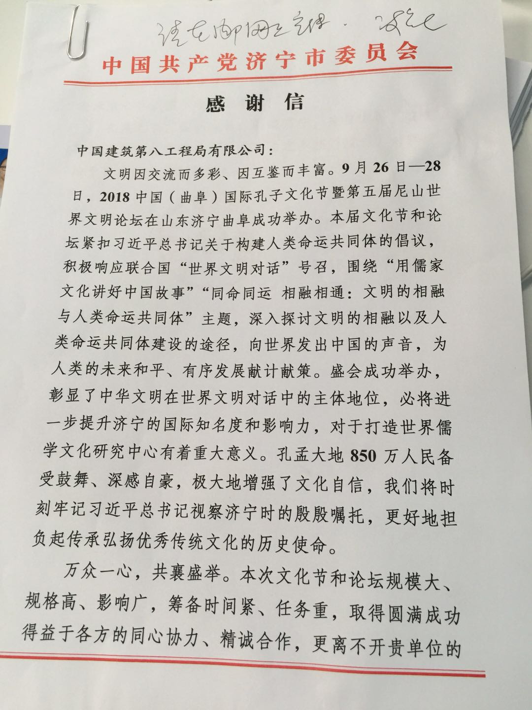 近日,中共濟(jì)寧市委、濟(jì)寧市人民政府向中建八局發(fā)來表揚(yáng)信。對由中建八局一公司承建的曲阜尼山圣境項(xiàng)目為2018中國(曲阜)國際孔子文化節(jié)暨第五屆尼山世界文明論壇成功舉辦做出的貢獻(xiàn)表示衷心的感謝。