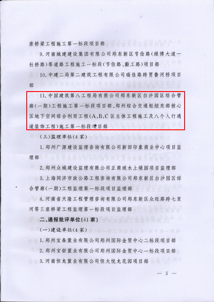 11月16日,在鄭東新區2018年第三季度“爭創標準化工地、打造精品工程”建設工作會議上,鄭州市鄭東新區管理委員會對管理規范、現場管理科學有序、工程實體質量較好的建設、施工、監理單位予以通報表揚。其中我司鄭東新區白沙園區綜合管廊項目部獲得表揚,這是暨第二季度講評會之后,鄭東新區白沙園區綜合管廊項目部連續兩個季度獲此殊榮。