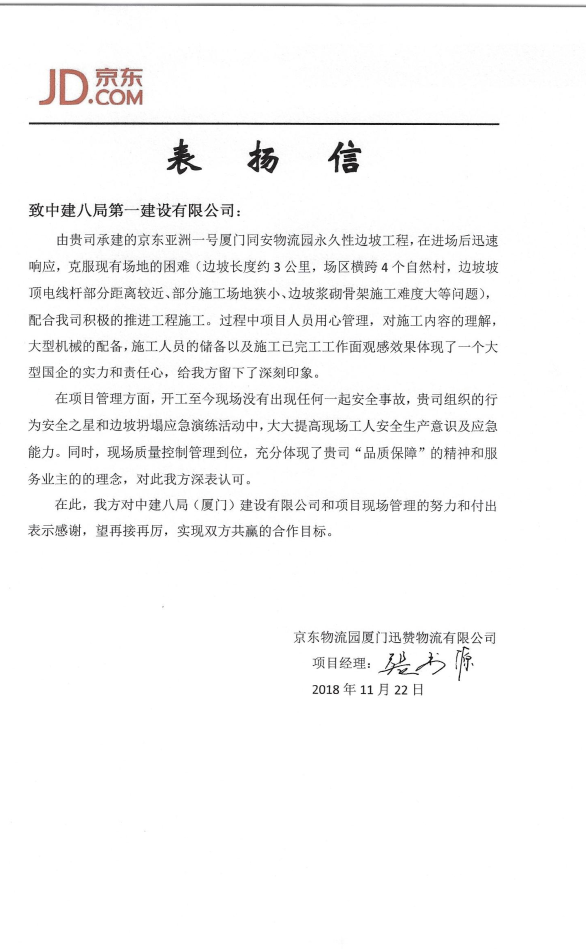 近日,廈門京東物流園項目部收到了業(yè)主發(fā)來的表揚信。在信中,業(yè)主對項目團(tuán)隊攻堅場地困難,過程質(zhì)量管控以及廈門公司高度重視給予了肯定。同時特別對公司質(zhì)量、安全標(biāo)準(zhǔn)化管控給予了高度評價。