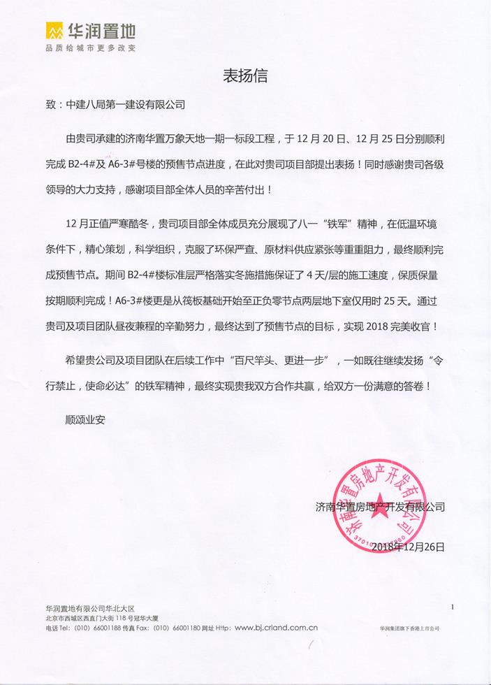 近日,濟(jì)南華置萬象天地項目一期一標(biāo)段總承包工程收到濟(jì)南華置房地產(chǎn)開發(fā)有限公司發(fā)來的表揚信,信中對一公司、濟(jì)南公司各級領(lǐng)導(dǎo)的大力支持及項目部管理人員在搶工期間攻堅克難和不畏勞苦的精神提出了表揚,并對項目管理團(tuán)隊給予了充分肯定。