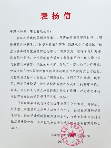 近日,蘇地2016-WG-57號西地塊項目收到魯能廣宇置業有限公司對項目部的表揚信,信中對公司工程施工給予了高度評價及肯定,并對項目團隊的團結協作提出表揚。