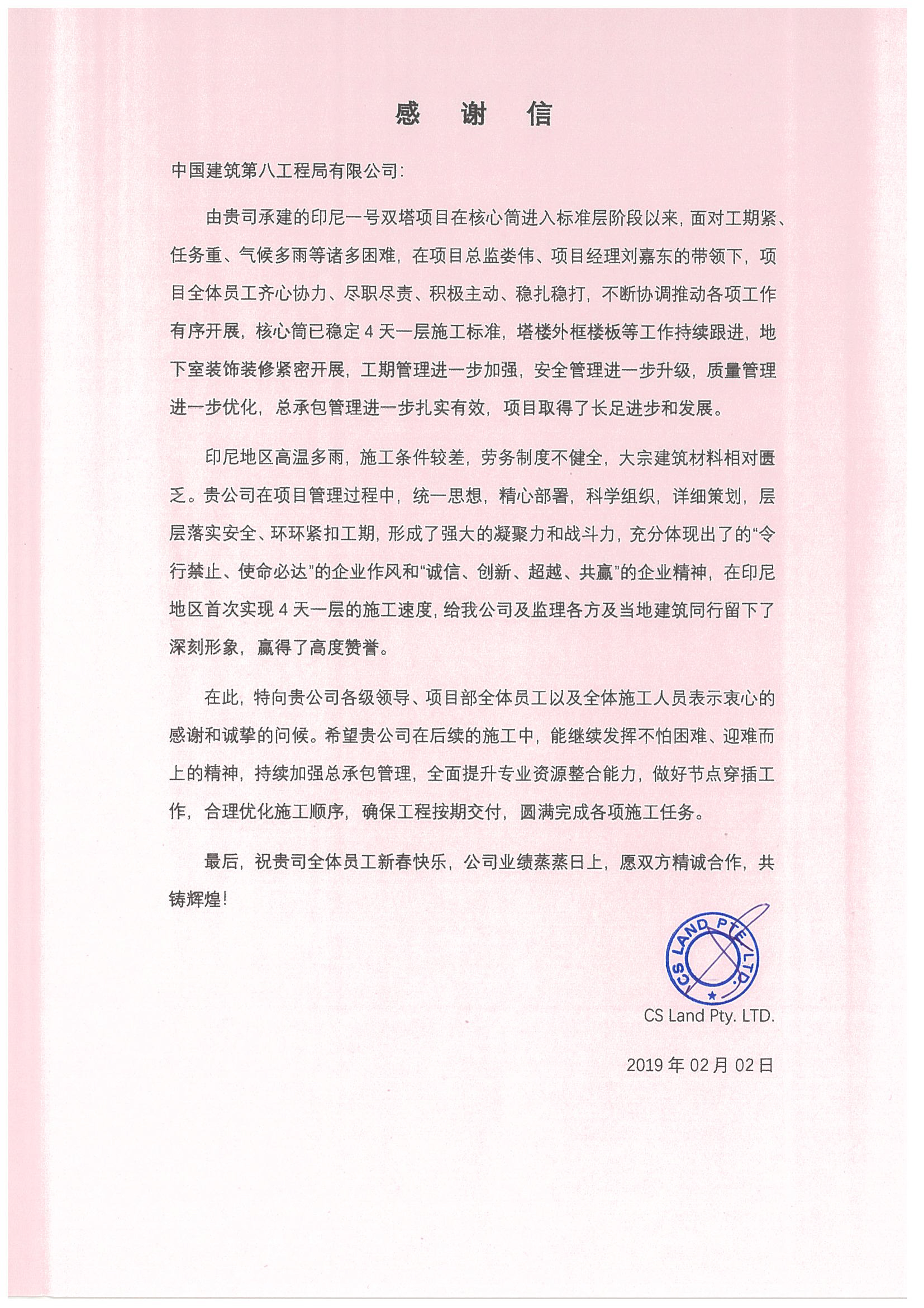 印尼一號雙塔項目喜獲業(yè)主表揚(yáng)信