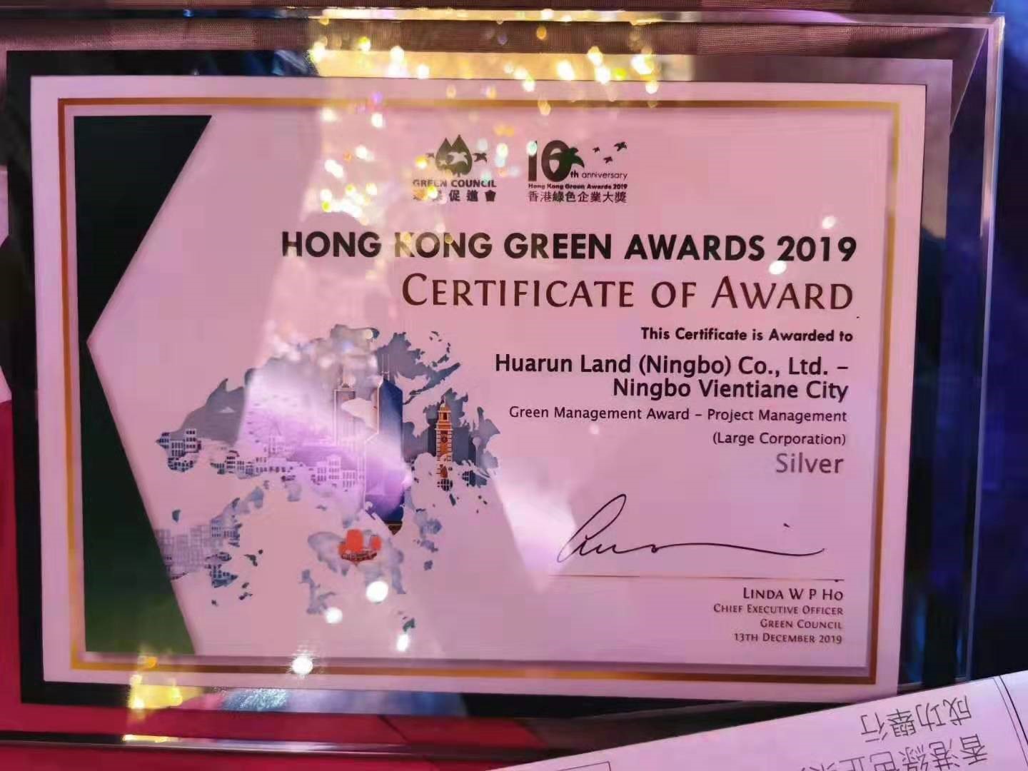 12月13日,香港綠色企業大獎在香港揭曉,寧波萬象城項目(唯一一個以項目名義參選,其他均以香港本地企業名義參選)榮獲優越環保管理獎(項目管理類)銀獎。該評選活動組由香港環保促進會主辦,香港政府部門及香港中華總商會、建造業議會、香港工業總會等多個機構參加評選;自2010年始每年評審一次,旨在表彰在日常運作中有卓越環保管理表現的企業,評審重點考慮企業對環境保護的重視程度及考察企業在環保管理方面的持續良好表現。