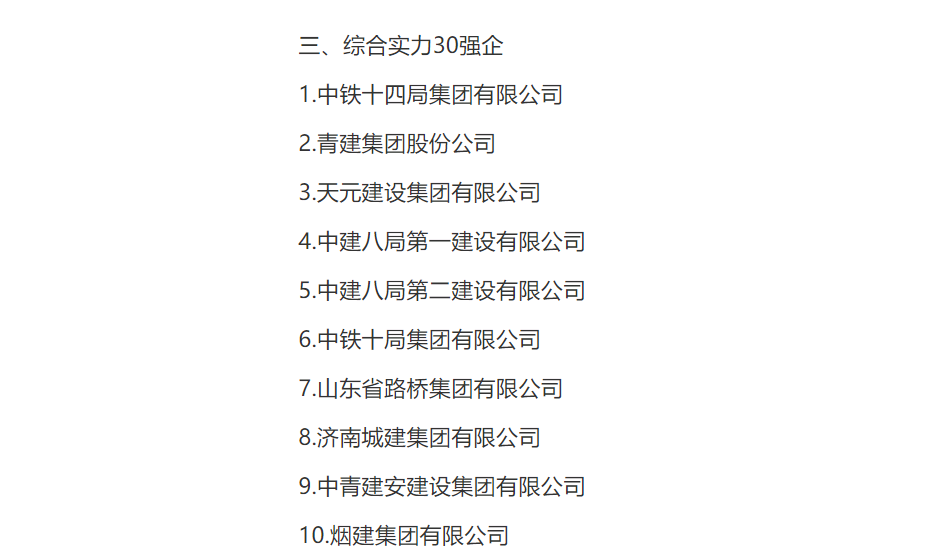 “山東省建筑企業(yè)綜合實力30強”由山東省住房和城鄉(xiāng)建設廳負責評選,主要根據(jù)企業(yè)規(guī)模和效益測算(總產(chǎn)值、利稅總額權重8:2)等經(jīng)營指標進行綜合測算排名。