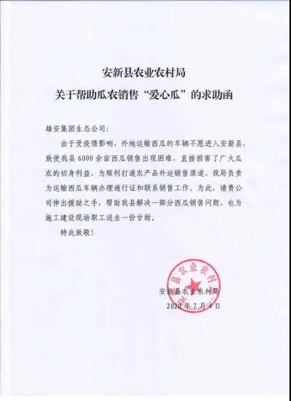 7月4日,中國雄安集團生態(tài)建設投資有限公司收到安新縣農業(yè)農村局發(fā)來的求助函。公司雄安站樞紐片區(qū)市政道路、綜合管廊、排水管網系統(tǒng)(一期)工程一標段項目部積極響應業(yè)主單位號召,當即選購滯銷西瓜約60000斤,為當地瓜農解燃眉之急。