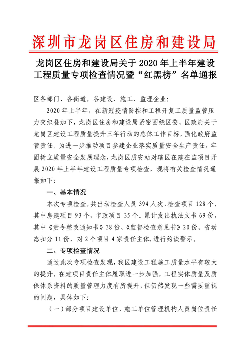 近日,深圳市住房和建設局公布了深圳市2020年度“亮劍行動”紅黑榜,歲寶國展中心項目、悅彩城(北地塊)項目、中廣核工程大廈項目登上紅榜,榮獲“安全生產示范工地”稱號。蘭著學校項目成功登上深圳市龍崗區建設工程質量2020年上半年“紅榜”,得到龍崗區住建局通報表揚。