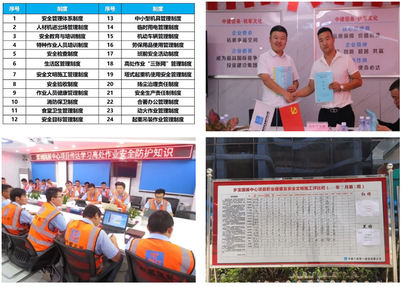 歲寶國展中心項目部自成立起,就把安全工作作為頭等大事來抓,先后編制安全生產責任制度、安全檢查制度、安全會議制度、安全教育制度、動火作業審批管理制度、班前活動管理制度、安全獎懲制度等一系列安全管理制度,并有序開展落實。
