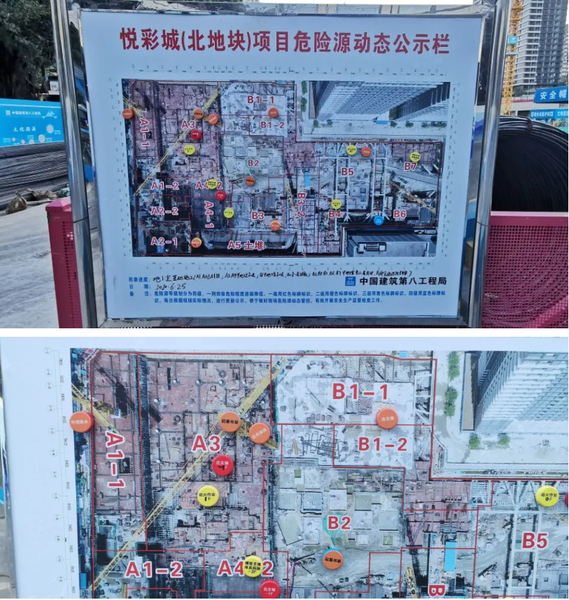 悅彩城(北地塊)項目進場以來,堅持“安全無小事”,用“責任心+執行力”的安全理念貫徹施工各環節,織起一張安全大網。項目在辦公區出口顯眼處、前往施工現場必經之處設置《危險源動態公示欄》,將現場危險源進行等級劃分,將航拍圖用軸網進行劃分,配合上現場網格化分區管理。讓每日巡查有針對性、有目的性,對現場的主要風險進行有效預防并及時消除現場隱患。
