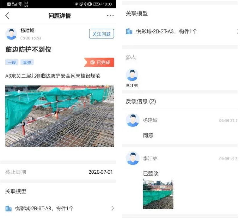 項目團隊積極使用C8BIM軟件應用,該應用以BIM模型為基礎,將安全、質量、技術、設計、物資等存在的問題,與BIM模型進行關聯,管理人員通過手持終端APP可對現場發現的問題簽發隱患整改單、聯系單等,最大程度發現并解決現場問題。