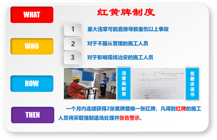 為使安全施工深入人心,項目還借鑒中廣核“一票出局”管理模式,實行紅黃牌制度。輕度違規人員得一張黃牌,須經教育后才能繼續上崗,一個月內連續獲得兩張黃牌即換一張紅牌,紅牌獲得者“一票出局”。