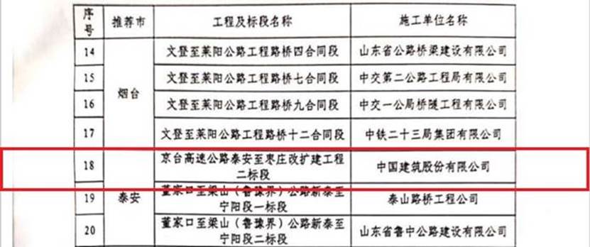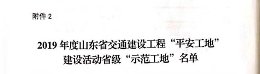 《山東省交通運輸廳關于2019年度交通建設工程平安工地建設省級“示范工程”和“示范工地”評選情況的通報》近日發(fā)布,京臺高速公路泰安至棗莊改擴建工程二標段“榜上有名”,榮獲平安工地建設活動省級“示范工地”稱號。
