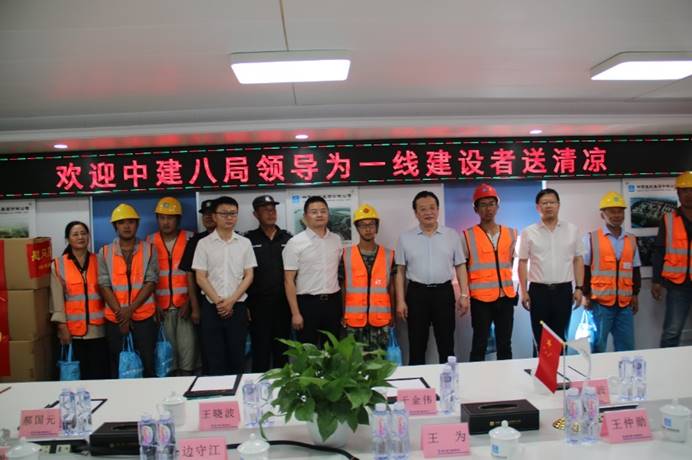 于金偉一行首先來到工人生活區參觀,深入了解一線工人們的吃、穿、用、住情況,對項目“工友村”的建設情況進行了詳細的了解,并聽取了項目運營情況作了整體匯報。于金偉對項目全體一線工人們表示感謝,并表達了對本項目的重視,為工人們發放防暑降溫物資,并囑托大家注意日常安全防護,做好防暑降溫工作。