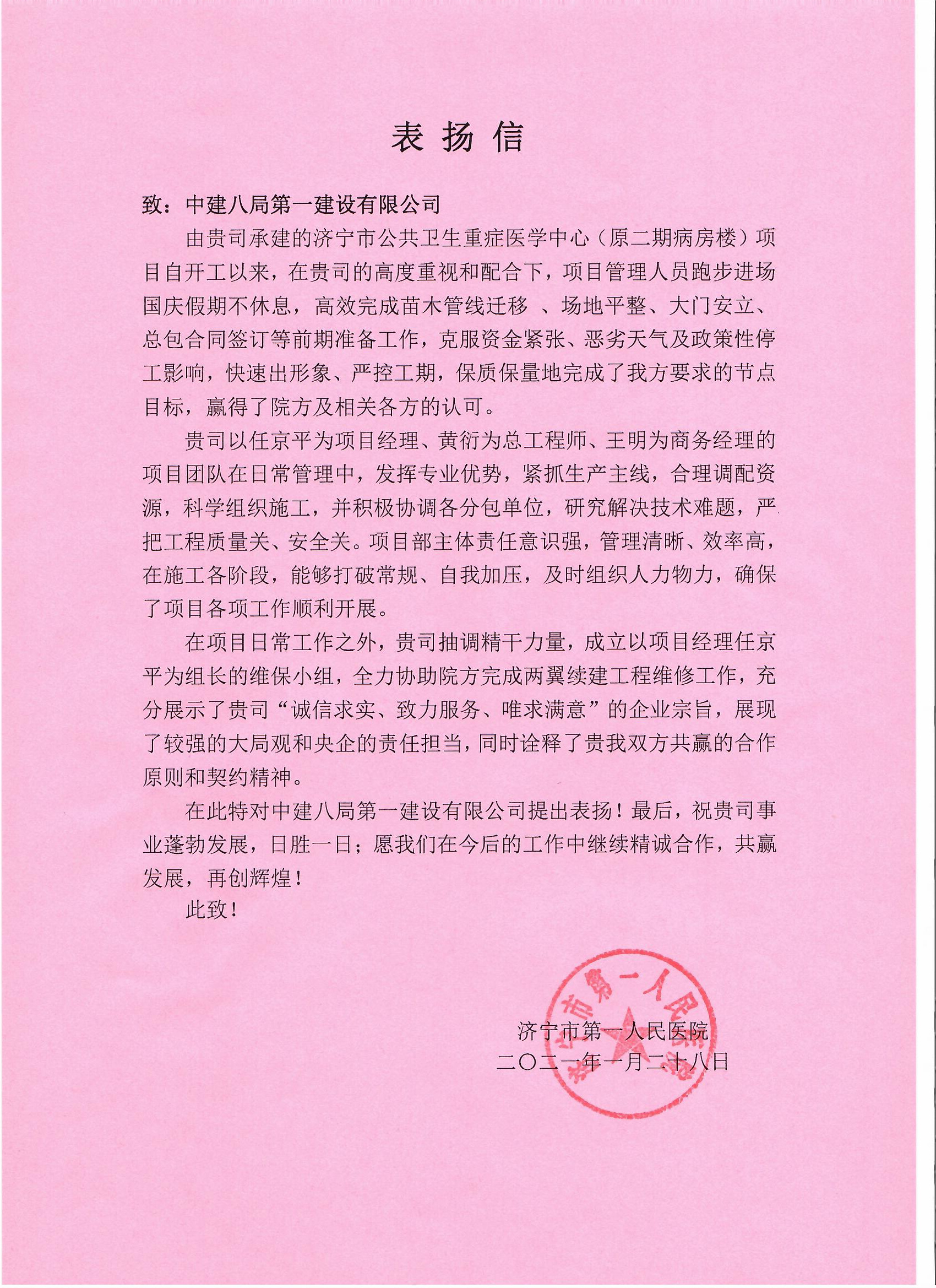 2月1日,濟寧市公共衛生重癥醫學中心項目部收到來自業主濟寧市第一人民醫院的一封表揚信。