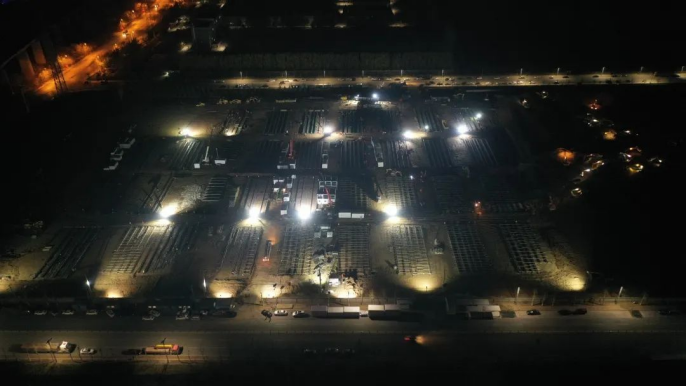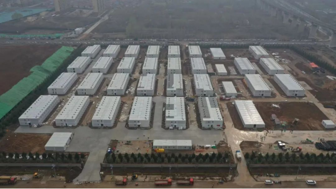 3月19日,各區域同時開工。10小時完成場地平整3.5萬平方米;20小時完成16棟箱房基礎模板支設;12小時完成基礎混凝土澆筑;6小時完成8900平方米室外道路硬化;48小時完成室外管道鋪設2800余米;72小時完成892間箱房組裝;48小時完成10萬余米電線電纜鋪設。28日晚,892間標準箱房全部亮燈;29日,成功交付504套隔離觀察房。