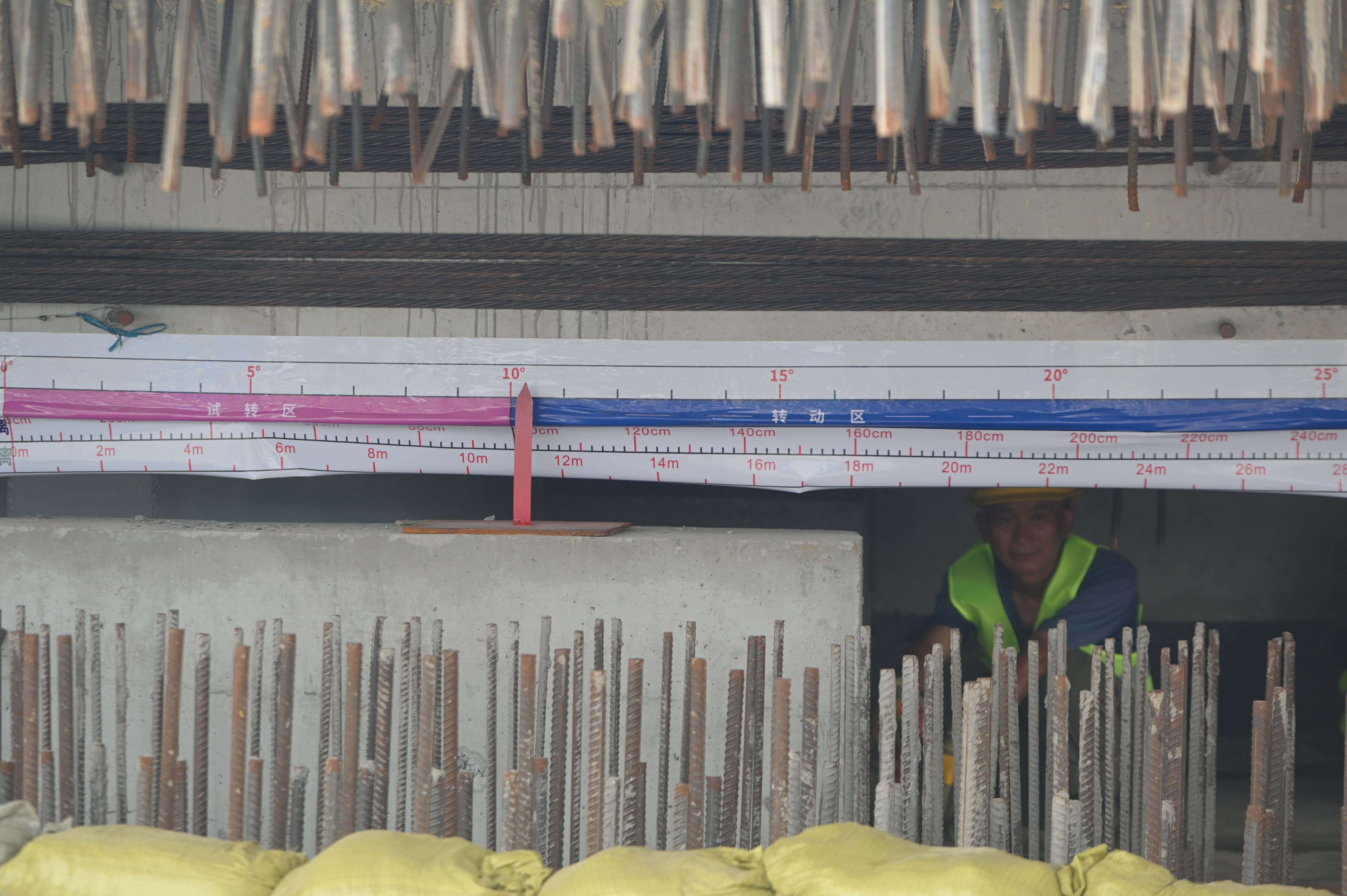 跨京九、邯濟鐵路(72+128+72)m轉體連續梁全長273.7米,橋面寬12.6米,主墩高10米,單個T構轉體重量11100噸。轉體需要兩個T構件“零誤差”合在一起,為實現精準對接,兩個主墩T構分別在兩臺300噸千斤頂、液壓泵站等轉體設備的牽引下,同步順時針轉體79度,最終完成兩個“巨無霸”的合體。