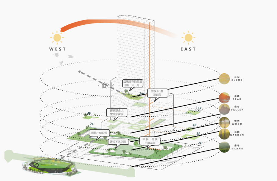 項目在景觀設計中遵循生態自然、開放多元、高效組織、以人為本的原則。通過線性的空間引導,使人們歡聚于中心環,形成了永續無界、回環流動的空間體驗,實現人文與自然和諧共生。
