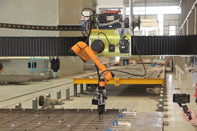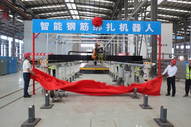 隨后,來(lái)到第六跨疊合板自動(dòng)化流水生產(chǎn)線,寧文忠、李鐵軍共同為智能鋼筋綁扎機(jī)器人揭彩。該機(jī)器人是一種可視覺(jué)導(dǎo)引的六軸鋼筋綁扎機(jī)器人,安放在流水線的鋼筋綁扎區(qū)域,能夠高效精準(zhǔn)的進(jìn)行鋼筋綁扎工作,具有自動(dòng)識(shí)別,精準(zhǔn)高效、協(xié)同作業(yè)、一機(jī)雙控等特點(diǎn),綁扎速度是人工的2倍,大大提高鋼筋綁扎效率。