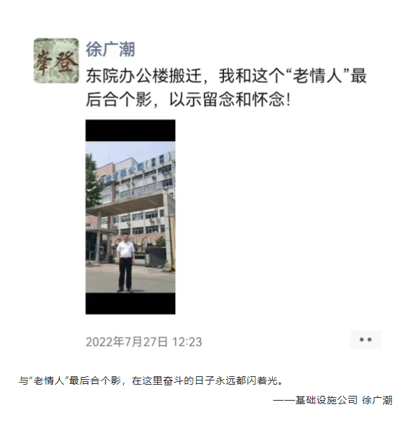 中建八局一公司東院建成于1996年,總建筑面積14430㎡。這棟26歲的“老房”見證了公司的發展,記錄著幾代八一人的奮斗故事和成長,如今即將分別,大家回憶在這里度過的美好時光,用鏡頭記錄下與“老房”最后的合照。