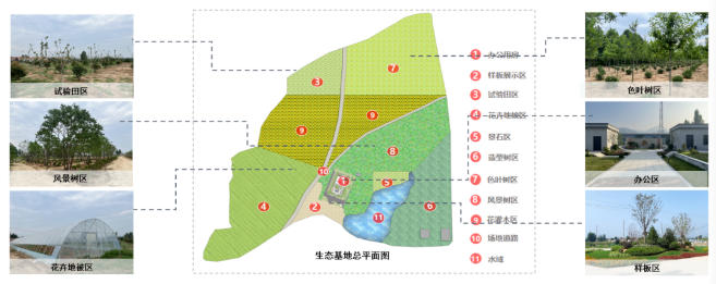 基地位于濟(jì)南市萊蕪區(qū),占地面積150余畝,包括樣板展示區(qū)、試驗(yàn)田區(qū)、花卉地被區(qū)、景石區(qū)、造型樹區(qū)、色葉樹區(qū)、風(fēng)景樹區(qū)、花灌木區(qū)、水域等共11個(gè)區(qū)域,涵蓋苗木種植、現(xiàn)代農(nóng)業(yè)研發(fā)等功能,主要有烏桕、櫸樹、樸樹、娜塔櫟、造型松、玉蘭等苗木品種。