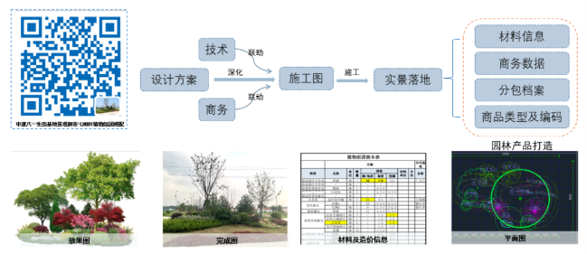 產(chǎn)品定制“身份號(hào)碼”,景觀“超市”自助結(jié)算,每一個(gè)商品都形成一個(gè)二維碼,分類編碼列入商品化圖冊,客戶根據(jù)意向選取產(chǎn)品,項(xiàng)目操作拼接完成后,施工圖、造價(jià)、集采渠道、分包商選項(xiàng)等同步實(shí)現(xiàn),更適配EPC模式的操作方式。
