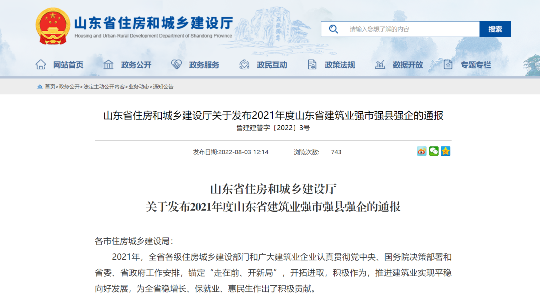 近日,山東省住房和城鄉(xiāng)建設(shè)廳印發(fā)《關(guān)于發(fā)布2021年度山東省建筑業(yè)強市強縣強企的通報》,中建八局一公司位列綜合實力30強企第2名,較上屆排名晉升2位,目前已連續(xù)5年蟬聯(lián)山東省建筑企業(yè)前4強。