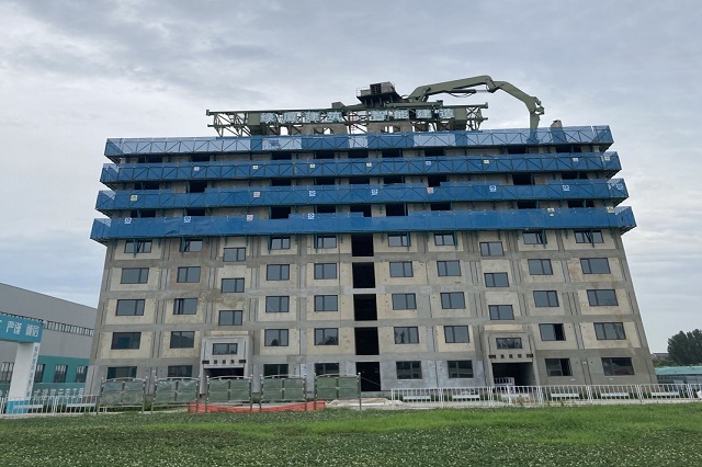 針對目前預制構件吊裝存在的單件構件自重大、吊裝作業專業性強、吊裝效率低等問題,中建科技(濟南)有限公司聯合山東奧堃智能裝備有限公司共同設計研發“裝配式建筑智能安裝系統”,該系統是安裝在施工層上部的一套可隨著樓層升高自動爬升的吊裝裝置,裝置由爬升立柱、軌道梁、折疊式機械臂、倒運小車和懸臂吊機五部分組成。該系統具有吊裝分離、安全智能、工作平穩、適用性強、定位精確、性能優越等優勢,該系統預制構件最大吊裝重量可達7.2噸,軌道最大跨度達24米,機械臂旋轉半徑達15米,可實現現場施工安拆方便、效率高、低碳環保。具體工作流程是:懸臂吊機將構架從樓下提升至倒運小車放置架→倒運小車將構件運輸至折疊式機械臂工作范圍內→折疊式機械臂擺放構件并進行微調→預制構件安裝固定→本層全部構件安裝完成→自爬立柱頂升,進行下一層施工。