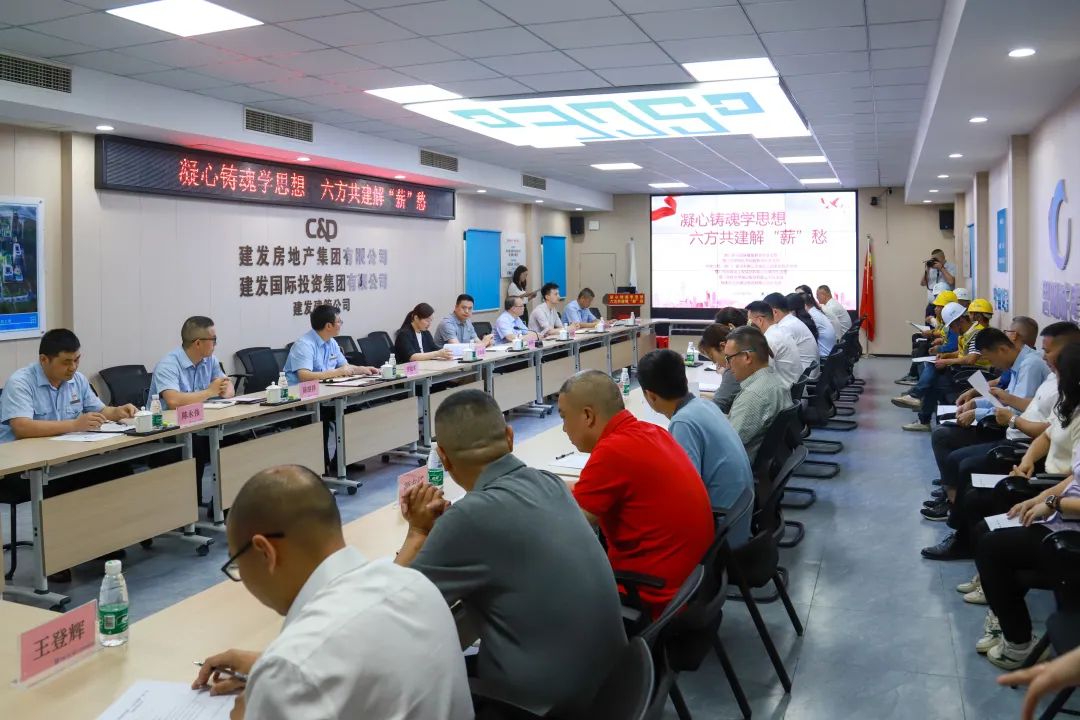 期間,與會人員觀看了企業宣傳片和廈門市勞動保障監察支隊公益廣告宣傳片,并重溫入黨誓詞。姜保收一行與湖濱片區改造提升項目各施工企業及工友代表進行座談交流,并實地調研了項目建設情況。