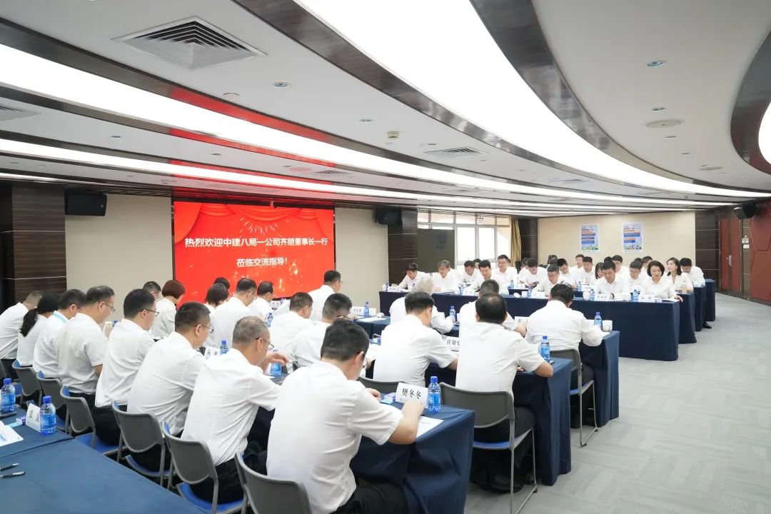 中建三局一公司黨委副書記、執行總經理向前,副總經理楊義雄,紀委書記蔡達,黨委副書記、工會主席李竹,副總經理廖向東,總工程師文江濤,副總經理謝俊凱,總會計師肖旭;中建八局一公司副總經理李云,紀委書記徐紅志,副總經理霍文濤,黨委副書記、工會主席聶麗,副總經理谷力,總工程師陳江,總會計師鄧崢驥及雙方總部相關部門、二級單位負責人參加交流。