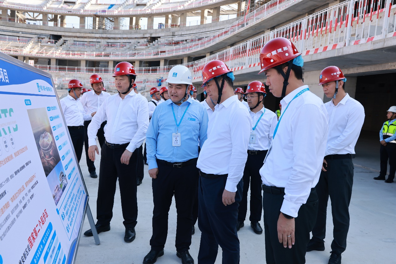 當天下午,調研組一行到黃河體育場項目現場調研,實地查看了施工現場,參觀了黨建展廳,聆聽了項目綜合匯報,了解項目履約管理、商務管理、創新技術應用等方面情況,詳細詢問了解項目在提升精益管控、人均效能方面的具體做法,了解公司制度規范的落地實施情況。