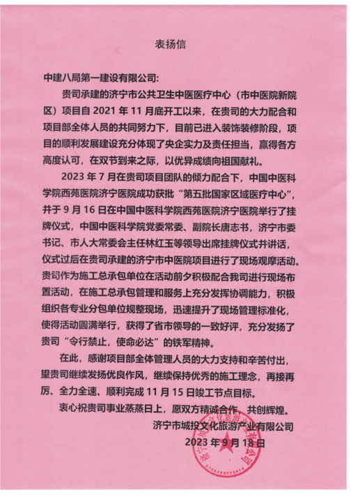 9月21日,中建八一承建的濟寧市公共衛(wèi)生中醫(yī)醫(yī)療中心項目收到業(yè)主濟寧城投發(fā)來的表揚信,對開工以來項目的發(fā)展建設(shè)和傾力配合表達了充分肯定。
