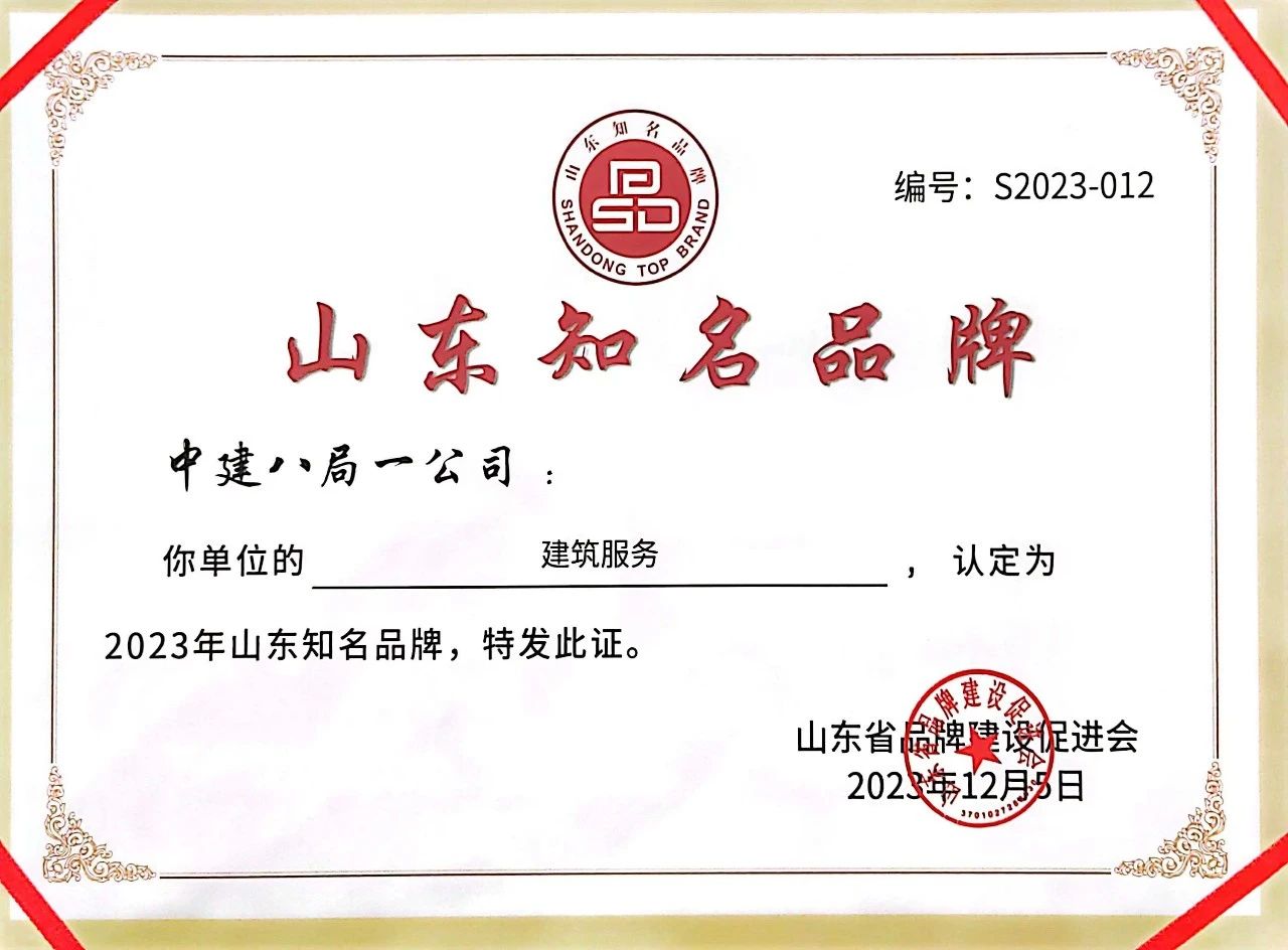 中建八局一公司以品牌強度883、品牌價值50.47億元,入選2023山東省重點行業品牌價值榜單,位列建筑建材類首位,并獲得2023年山東知名品牌認定。