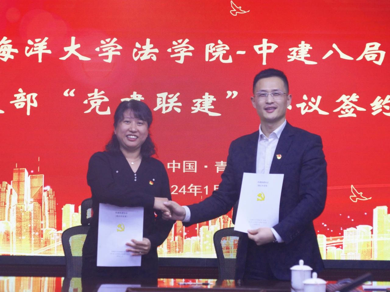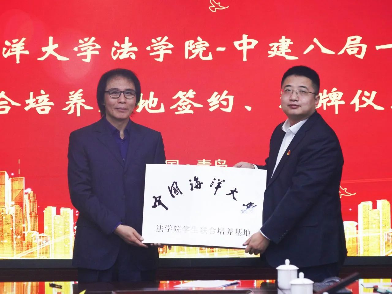 1月8日,中國海洋大學(xué)法學(xué)院與中建八局一公司聯(lián)合培養(yǎng)基地簽約授牌暨黨支部“黨建聯(lián)建”簽約儀式在青島舉行。法學(xué)院黨委書記劉健、院長桑本謙、辦公室主任王雅婕、法碩中心執(zhí)行主任于曉藝;中建八局一公司相關(guān)負責(zé)人參加。