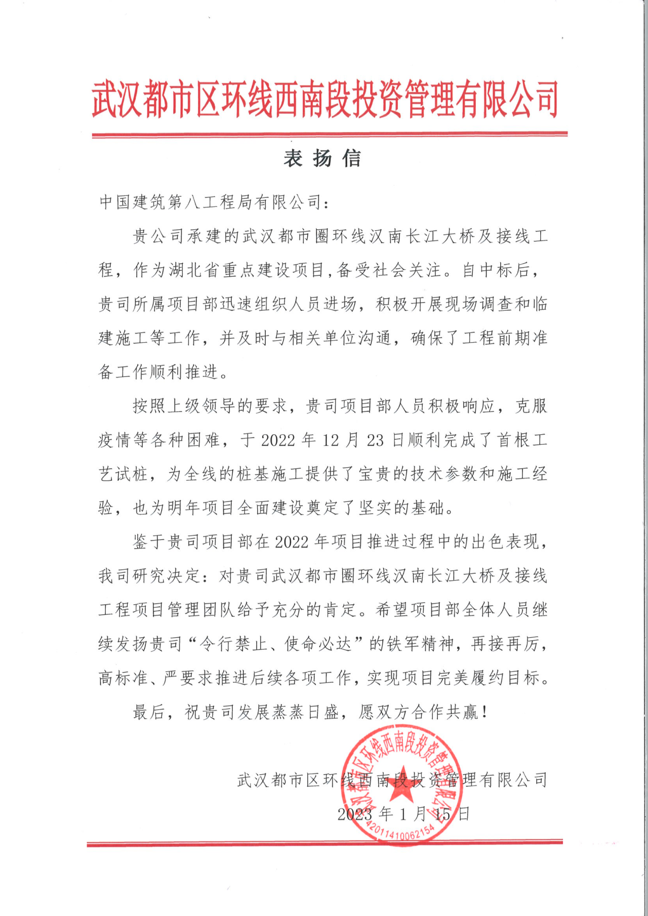 自進場以來,項目團隊充分發揚鐵軍精神,整合優勢資源,快速推進項目建設,創下多個全線“率先”:率先完成首樁施工,率先完成涉河、湖施工手續辦理,率先完成棧橋方案的專家論證,率先具備進河、湖施工條件,完成首座涉河棧橋貫通,建設速度持續領跑全線,多次獲得業主表揚信。