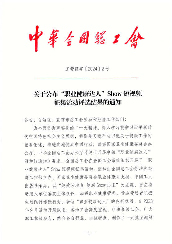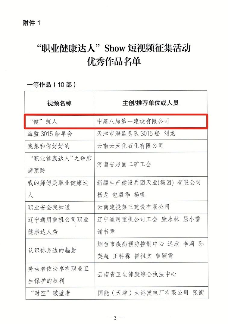 近日,由中華全國總工會勞動和經濟工作部主辦、國家衛生健康委職業健康司支持、中國工人出版社承辦的“職業健康達人”Show短視頻征集活動公布獲獎名單,中建八局一公司參選作品《“健”筑人》專題視頻短片榮獲一等獎。