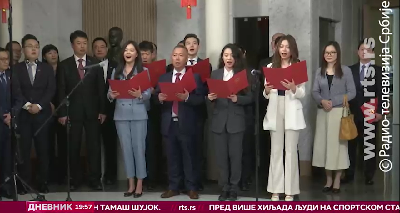 招待會期間,駐塞使館外交官合唱塞語傳統民歌《這就是塞爾維亞》,塞樂隊演唱《月亮代表我的心》《思念》等中文歌曲,現場氣氛熱烈友好。