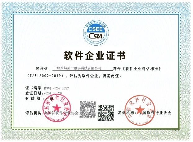 近日,山東省軟件行業協會公布“雙軟”認證名單,中建八局第一數字科技有限公司成功通過“軟件企業”認證,自主研發的6款產品,成功通過“軟件產品”認證。