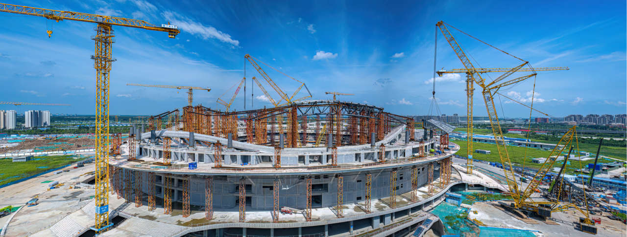 項目采用世界杯FIFA最新標準,將多種高新科技融入建造當中,是世界首個平面單層膜輪輻式索膜結構體系、國內首例專業足球場大規模應用高透光率PTFE網格膜材料、國內施工最復雜的專業足球場之一,目前項目處于屋蓋鋼結構施工階段,預計2024年完成合攏。